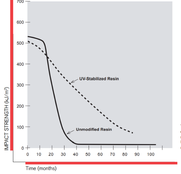 普通塑料和抗UV改性塑料长时间户外后的冲击强度变化
