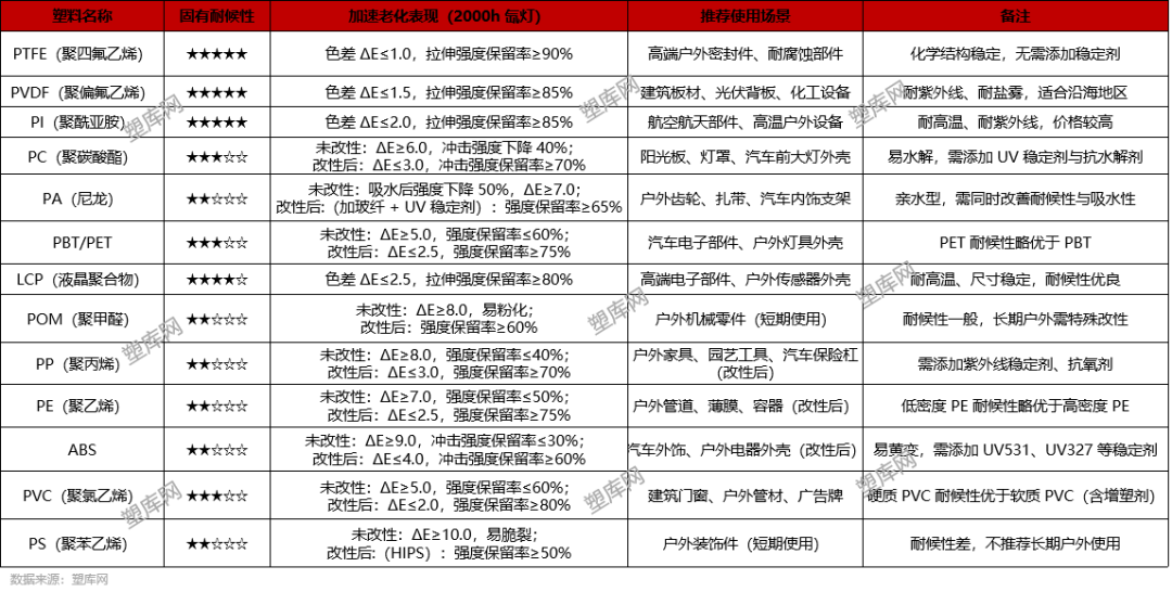 不同塑料的化学结构决定了其固有耐候性差异。以下是常见塑料的耐候性对比及适用场景: