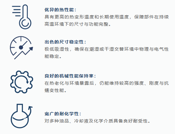 高温聚酰胺(PPA)凭借其独特的半芳香族结构,在多项关键性能上实现显著提升,尤其适用于长期高温、高湿或高负荷环境下稳定运行的场景。其主要优势包括: