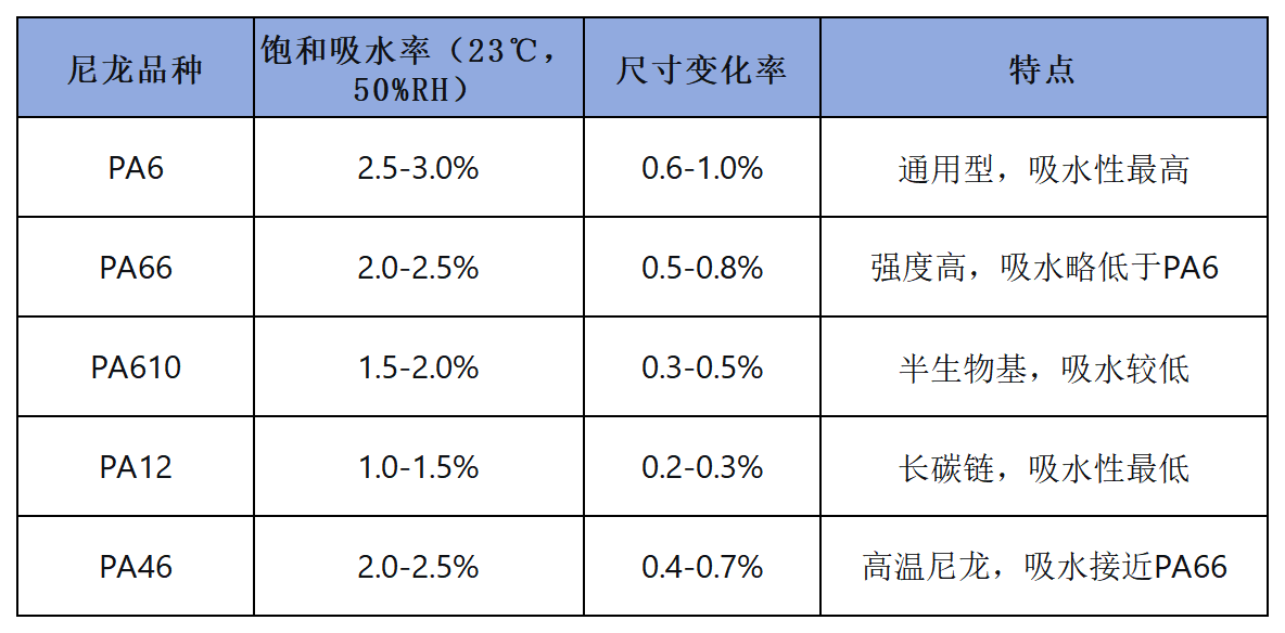 不同尼龙品种的吸水率对比