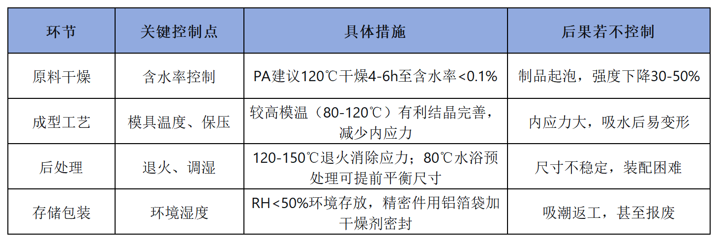 源头选材法:换个“不爱喝水”的尼龙。 PA12吸水率只有1.5%左右,PA610、PA46也相对低。如果成本能接受,直接从材料源头解决问题,省去后续很多麻烦。