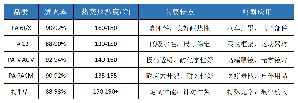 透明尼龙家族成员众多,各具特色。了解这些不同品类是正确选材的前提。以下是市场上主流的透明尼龙类型及其特点: