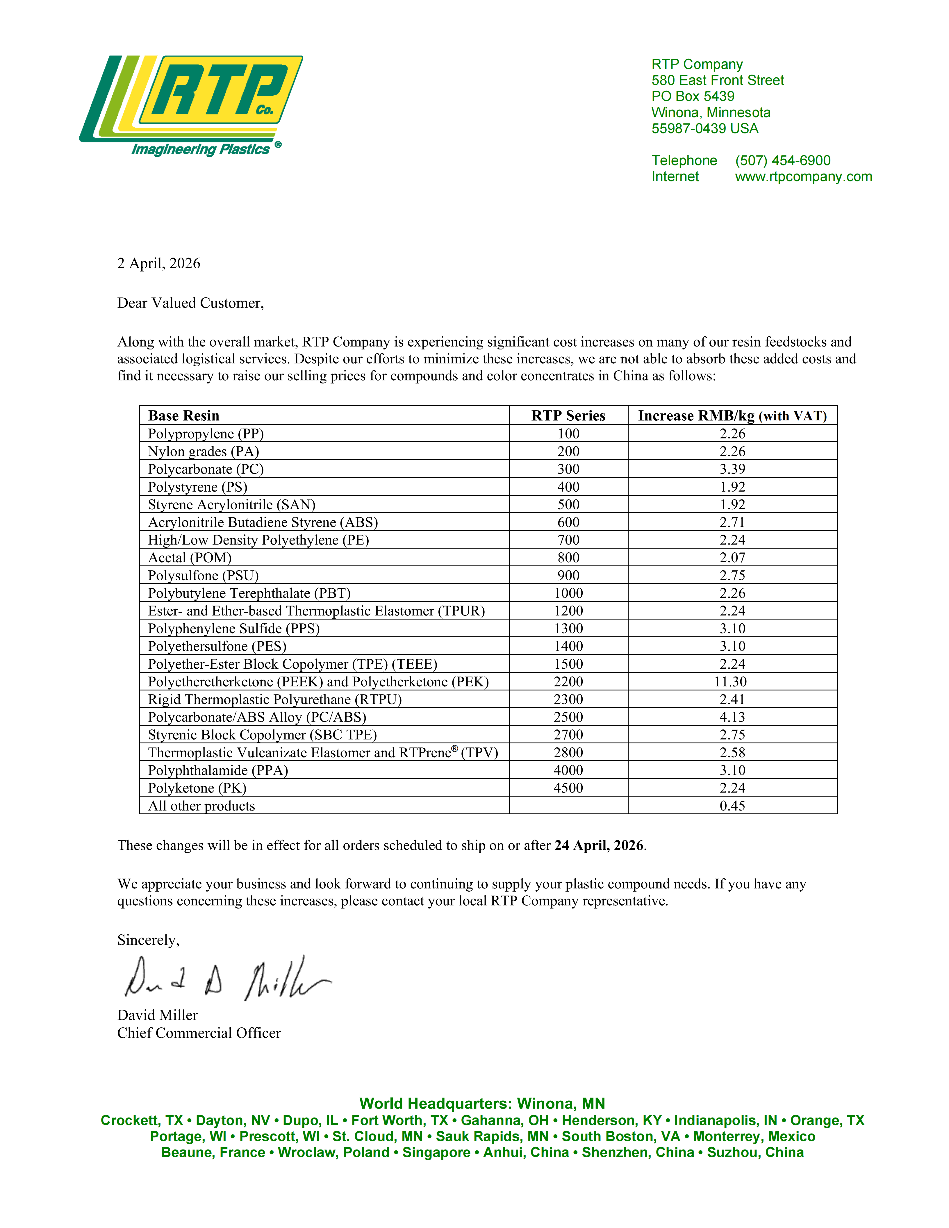 RTP 公司价格上调通知(2026 年 4 月)