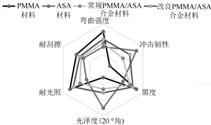 从雷达图可以看出,改良PMMA/ASA合金材料在各项关键性能上表现均衡且优异,没有明显短板。