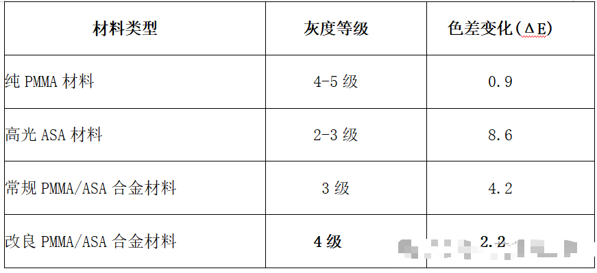 测试结果显示,改良PMMA/ASA合金材料的刮擦后色差变化ΔL值仅为0.6,远优于高光ASA材料(ΔL=6.1)和常规PMMA/ASA合金材料(ΔL>1.5),接近纯PMMA材料(ΔL=0.3)的优异表现。