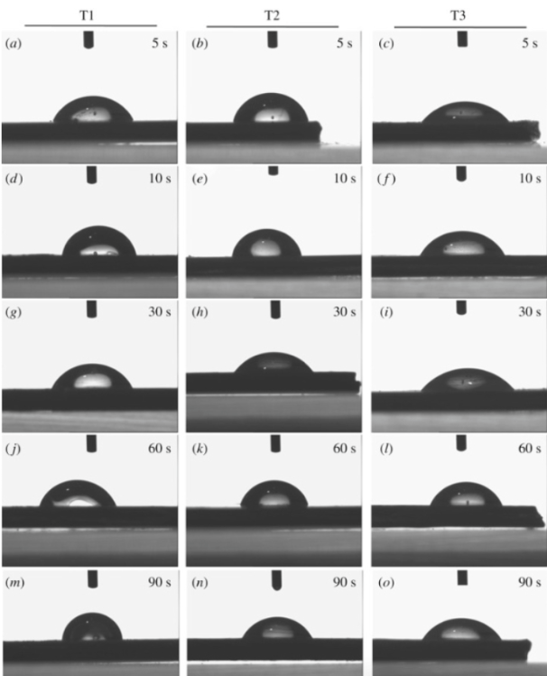 (经不同磺化程序和反应持续时间改性的PEEK表面的水接触角)