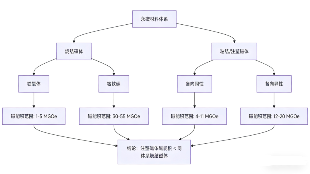 磁能积(BH),尤其是最大磁能积(BHmax),代表了磁体单位体积储存的磁能密度,是衡量材料磁性能强弱的核心指标之一。如下图所示,不同永磁材料的磁能积范围存在显著差异,注塑磁体的磁能积通常低于烧结磁体。