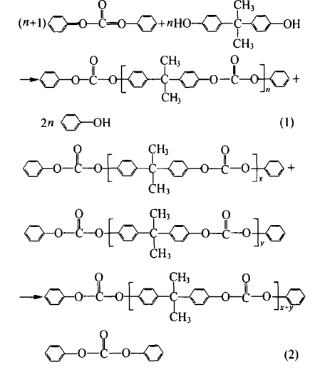 为获得预期分子量的聚碳酸酯,起始碳酸二本酯须过量,且须不间断并尽可能多地从反应物系中移出反应生成的低分子产物苯酚来调节两基团数量比,控制分子量。