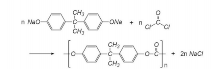 光气界面缩聚工艺通过将光气溶解于有机相二氯甲烷并与溶解于水相中的双酚A钠盐以胺类为催化剂、50℃条件下在两相界面进行缩聚反应。产物聚碳酸酯进入有机相并被溶解,副产物氯化钠溶于水相。溶有产物的有机相经洗涤、脱盐、脱溶剂、过滤干燥等一系列后处理得到产物聚碳酸酯。