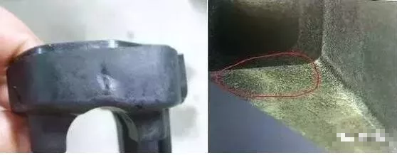 尼龙熔体注入型模时,会形成“喷泉”效应,即玻纤会由内部向外表流动,与型腔表面接触,由于模具型面温度较低,质量轻冷凝快的玻纤被瞬间冻结,若不能及时被熔体充分包围,就会外露而形成“浮纤”。