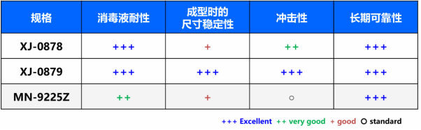 特长 ✓ 对各种消毒液具有优异的耐性 ✓ 热稳定性高、成型稳定性优异 ✓ 耐UV性、耐干热性等长期可靠性优异 ✓ 耐冲击性优异