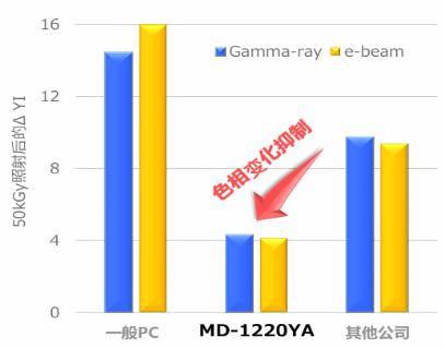 MD-1270YB与一般PC相比具有 『抑制γ射线、电子束照射引起的颜色变化』和『极高的耐脂肪乳剂性』, 非常适合医疗耗材用途。