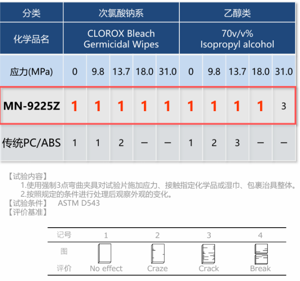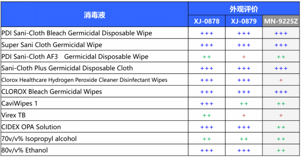 XJ-0878、XJ-0879两款材料对于在医疗机构使用的各种消毒剂均具有优异的耐性。