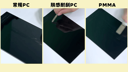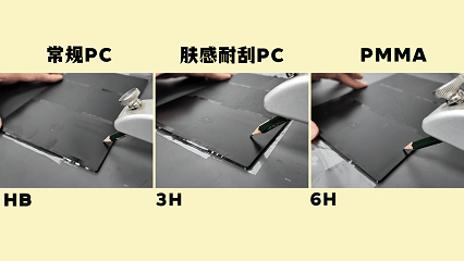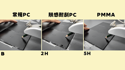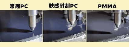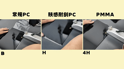 ⏩ 加大难度的皮纹面挑战,常规PC挑战HB,肤感耐刮PC挑战3H,PMMA挑战6H,结果: