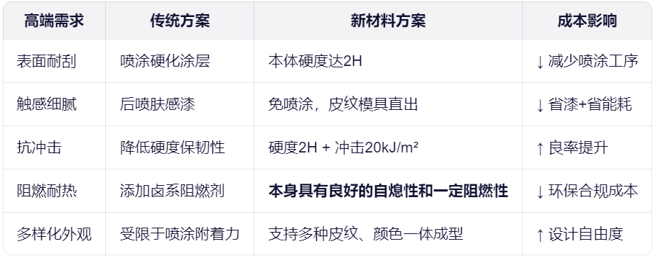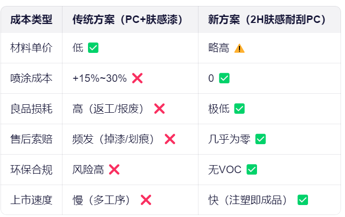 普通 PC 虽韧,但表面易划伤、触感生硬,也难以满足高端产品的体验需求;