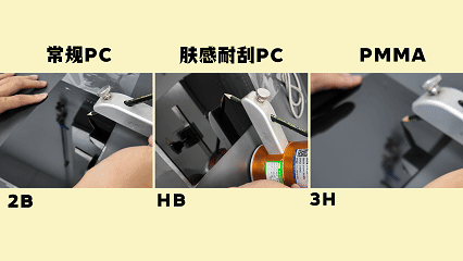 ⏩ 加大难度的光面挑战,常规PC挑战B,肤感耐刮PC挑战H,PMMA挑战4H,结果:
