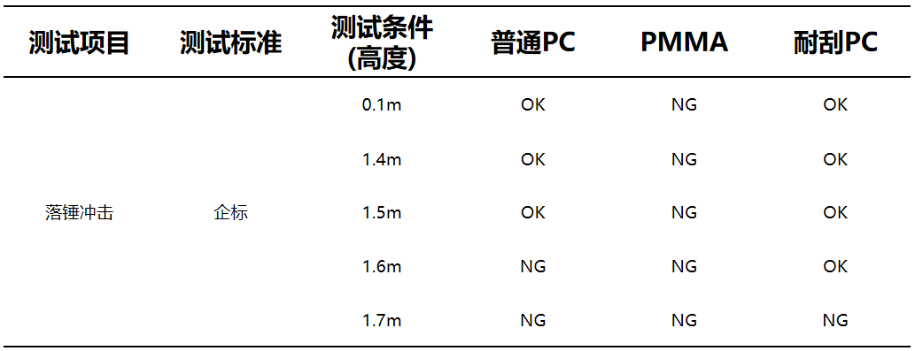 硬度“王者”PMMA——尽管表面硬度更高,却在仅 0.1 米高度、4kg 落锤的冲击下败北,连最基础的抗冲击门槛都未能跨过。