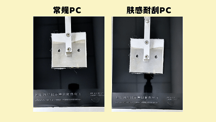 肤感耐刮PC的刮痕就浅且少得多,不说能与PMMA比肩,但是,明显比常规PC优秀得多。