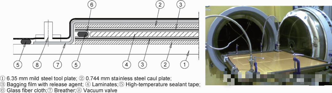热塑性复合材料热压罐成型技术和热固性复合材料热压罐工艺基本类似。热塑性预浸料按铺层要求铺放于模具上,并密封在真空袋中后放入热压罐中,经过热压罐设备加温、加压,使预浸料坯件成为所需形状和质量要求的构件。