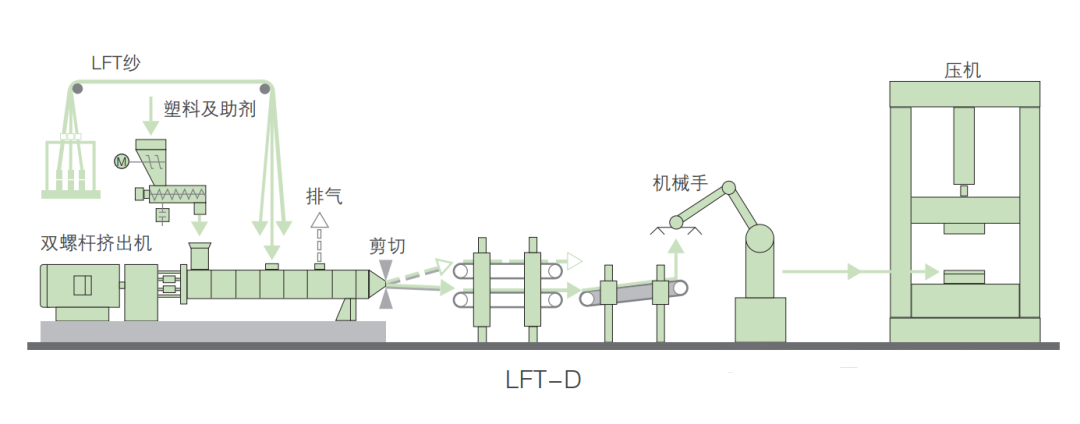 短纤增强热塑性粒料通常采用注塑成型工艺;长纤增强热塑性材料的成型则分为直接法LFT-D、间接法LFT-G: