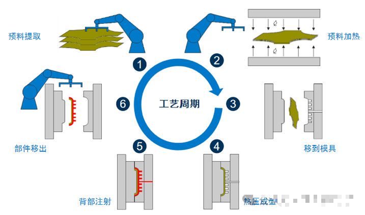 模压成型操作简单、成型周期短、易于实现自动化,可用于成型平板或者小变形制件,对于一些复杂的特征、安装位及加强筋,使用模压成型很难实现,因此市场上出现模压注塑一体成型工艺,如ENGEL的Organomelt工艺、克劳斯玛菲的FiberForm工艺等。
