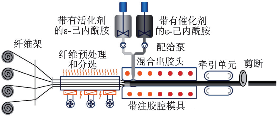 热塑性复合材料原位拉挤成型技术指的是在牵引设备的牵引下,经过树脂浸润的连续纤维或其织物通过加热成型模具,在模具内树脂发生聚合反应成为高分子量聚合物,最后经冷却获得复合材料制品的成型技术。热塑性复合材料原位拉挤成型技术具有生产效率高,可连续化大规模生产;设备简单,成本低;产品质量稳定,可重复性高等优点。