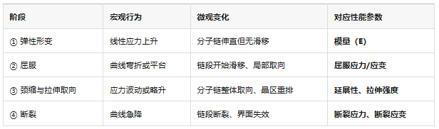 当一根塑料试样被拉伸时,其内部经历了几个典型阶段,每个阶段都对应不同的分子层级响应: