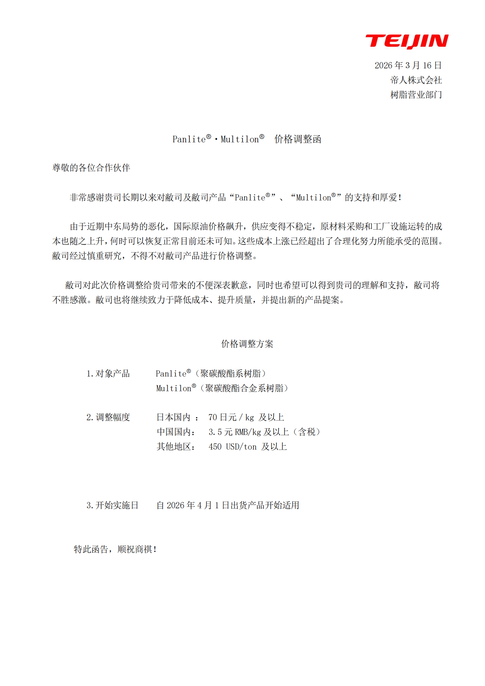 帝人PanliteⓇ・MultilonⓇ 价格调整函