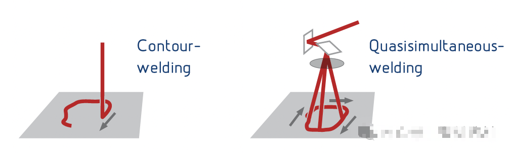 激光束沿焊缝轨迹逐点熔化,类似金属焊接。适合焊缝清晰、结构规整的产品。