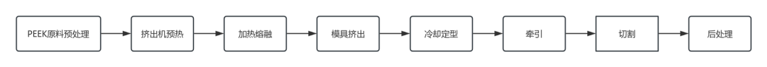 PEEK颗粒 120-150℃烘干4-6h,挤出机分段预热 300-390℃,低速熔融后经模具成型,水浴或空气冷却,牵引切割,按需退火消应力。适用于连续生产管材、板材、型材(如 PEEK 耐高温管材、电子绝缘板材)。