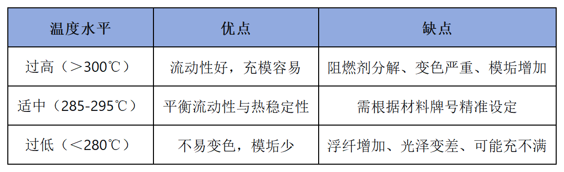 模温过高:阻燃剂析出增加,模垢严重,排气槽可能失效