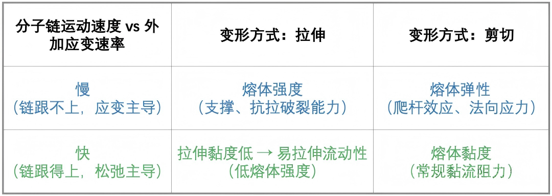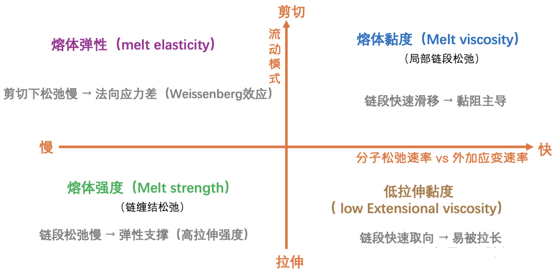 🗣️主要受分子链缠结密度、长支链结构、结晶速率等影响
