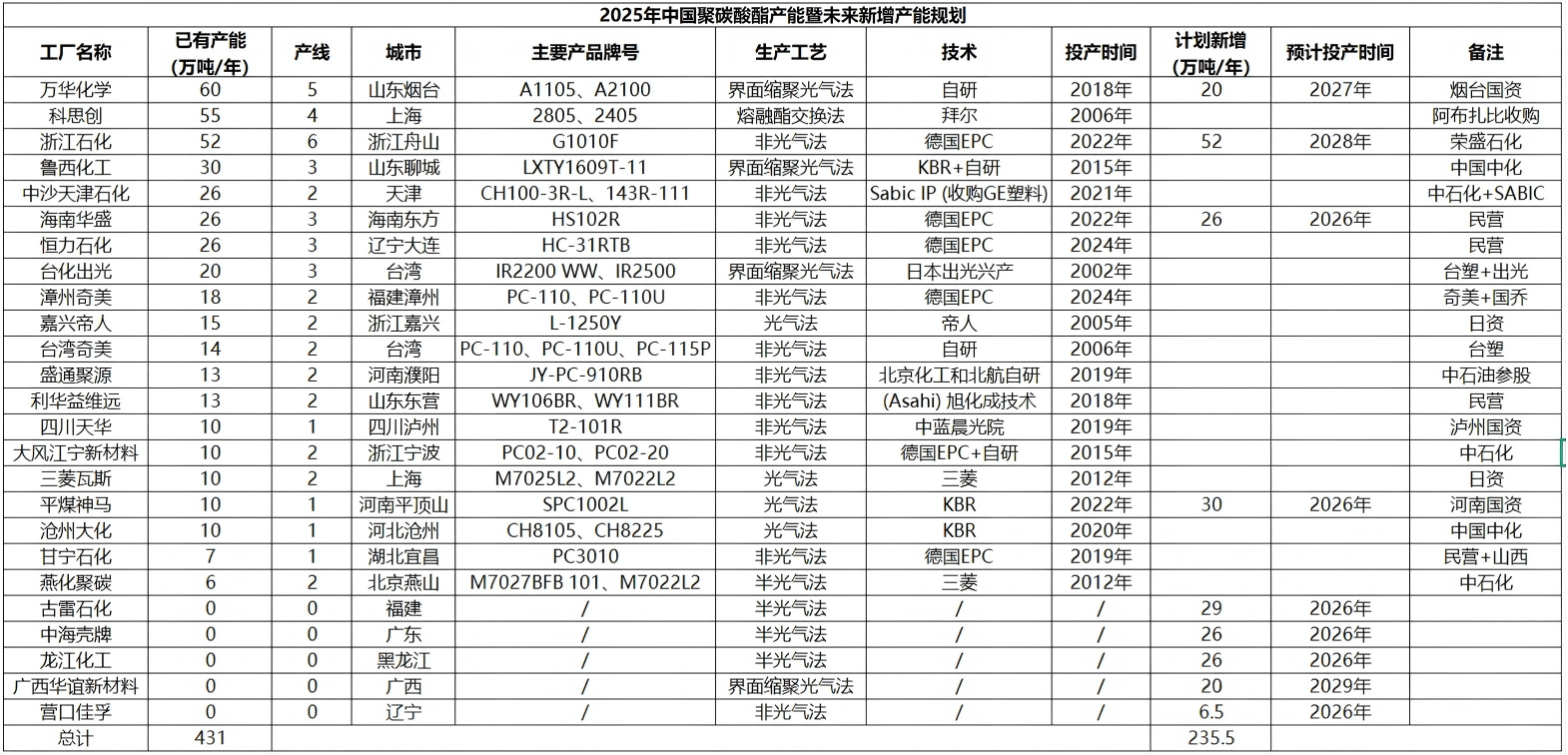 1、截至2025年12月,全球聚碳酸酯(PC)产能约800W吨/年,其中中国(包含台湾省)产能为431W吨,占比54%;另外,在中国还有235.5W吨/年的新增产能计划在路上,全部达产后全球聚碳酸酯(PC)产能将突破1000W吨/年(预计2029年)。