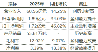 道恩股份2025年年报呈现营收净利双增的良好态势。营业收入60.56亿元,同比增长14.25%;归母净利润1.89亿元,同比大增34.03%;扣非净利润增长46.82%,显示出盈利质量显著提升。