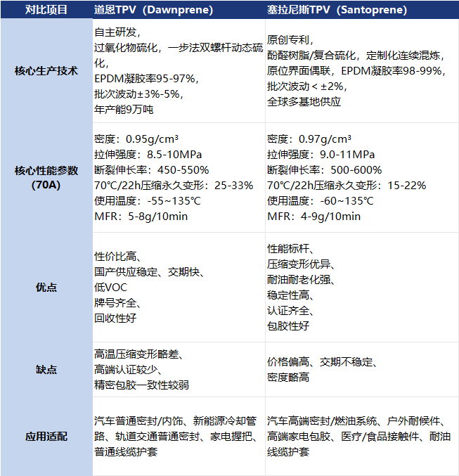 注:均为EPDM/PP动态全硫化TPV,核心对标70A级,数据为市场典型值,仅供参考