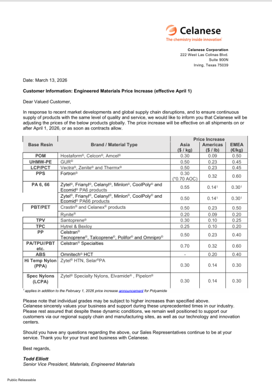 近期中东战事一点也没有停息下来的迹象,国际巨头的涨价函此起彼伏已经涨到麻木,比如最近塞拉尼斯又……发涨价函了,全系列包含TPV产品大幅上调,而且供应也是非常紧张,交期延长到8周以上了!!!被国际原材料断供折磨得死去活来的老铁们,可以关注考虑一下国产TPV明星道恩的各系列产品了。