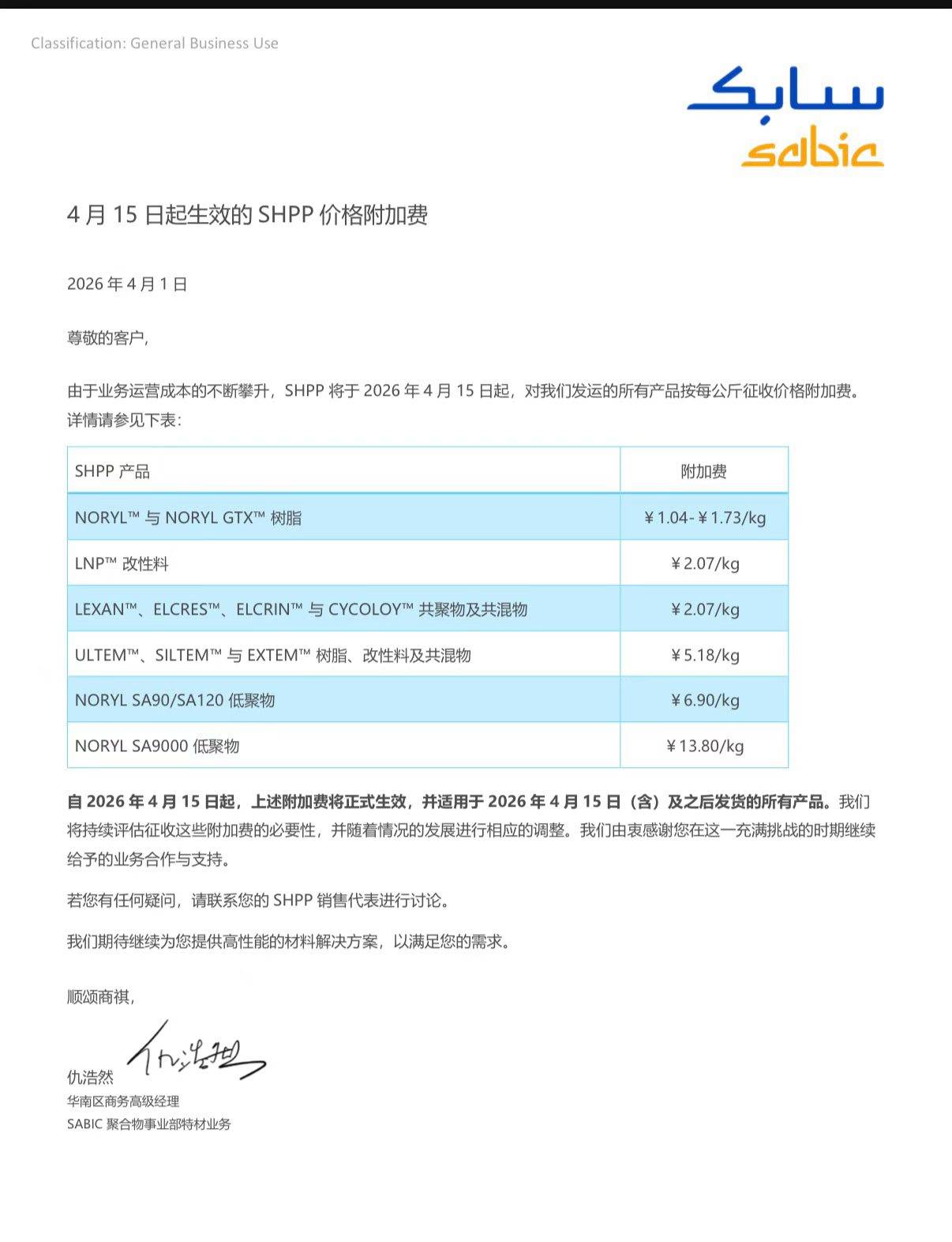 SABIC 4月15日起生效的SHPP价格附加费通知