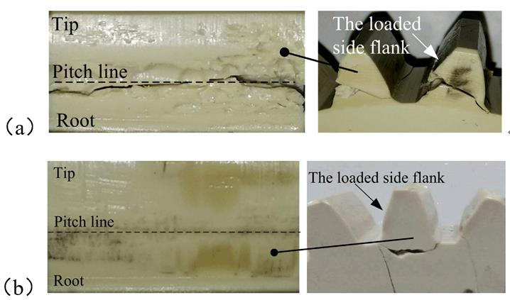 PEEK齿轮在中等载荷(a)以及重载荷(b)条件下的失效形式