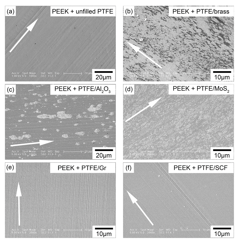 近十年来,科研人员致力于研究固体润滑剂聚四氟乙烯(PTFE)对PEEK摩擦学性能改善的作用。Burris等演讲表明在特定的测试工况下PEEK/PTFE的摩擦系数不仅比PEEK低,甚至还会小于固体润滑剂PTFE单独作用时的摩擦系数。并且,PEEK/PTFE复合材料的磨损率相比纯料PEEK得到了超过两个数量级的降低。磨损面分析显示这是因为带状的PTFE会覆盖在PEEK的裸露磨损表面上以形成润滑性能良好的保护层,从而改善了复合材料总体的摩擦学性能。