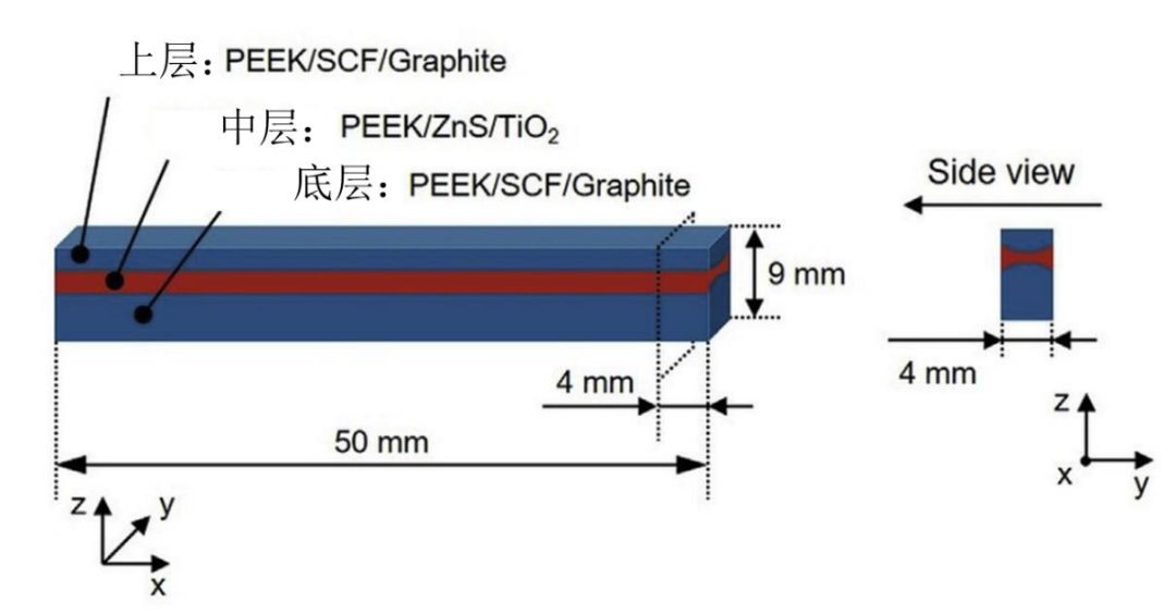 Lin和Schlarb的工作介绍了一种将两种具有不同成分的PEEK复合材料(PEEK/SCF/石墨和PEEK/ZnS/TiO2)通过胶粘结合在一起而制成的“三明治”层状复合材料材料。