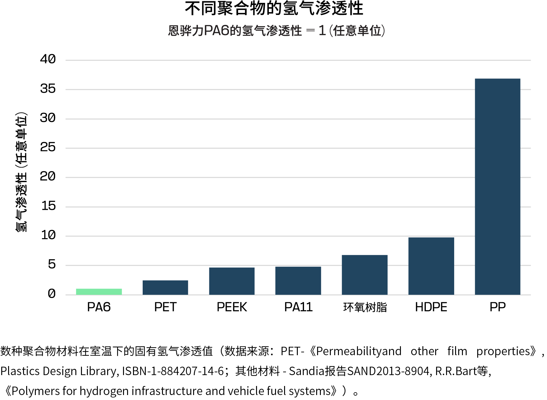 氢气渗透率:PA6的渗透率仅为HDPE的1/10、PA11的1/5。在700巴高压下,每平方米材料每天的氢气泄漏量,PA6比传统材料少近90%。